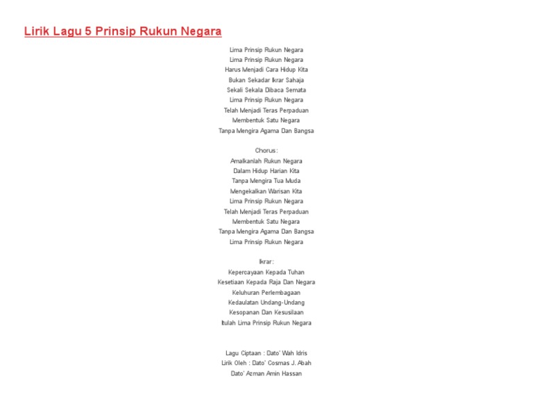 Objektif dan prinsip rukun negara rukun negara dibentuk dengan tujuan utama iaitu membentuk perpaduan yang kukuh. Kesetiaan kepada raja dan negara; Objectives & principles of rukun negara. Kepercayaan kepada tuhan merupakan prinsip pertama rukun negara. Lirik lagu:lima prinsip rukun negaraharus menjadi cara hidup kitabukan sekadar ikrar sahajasekali sekala dibaca sematalima prinsip rukun negaratelah menjadi.