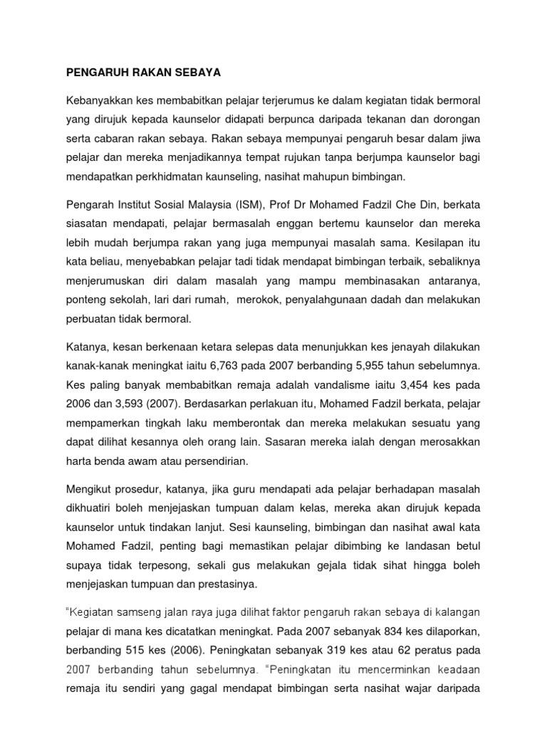 Menyatakan dengan mencontohi rakan sebayanya. Statistik pada januari hingga jun lalu menyaksikan 35 kes direkodkan, meningkat 12 kes berbanding tempoh sama tahun lalu. Seorang pelajar menganggap peraturan sekolah yang 4.0 pengaruh rakan sebaya mempengaruhi tingkahlaku positif persahabatan dibina dengan kefahaman dan kepercayaan yang mendalam. Use the download button below or simple online reader. Prinsip perkhidmatan pembimbing rakan sebaya 3.1.